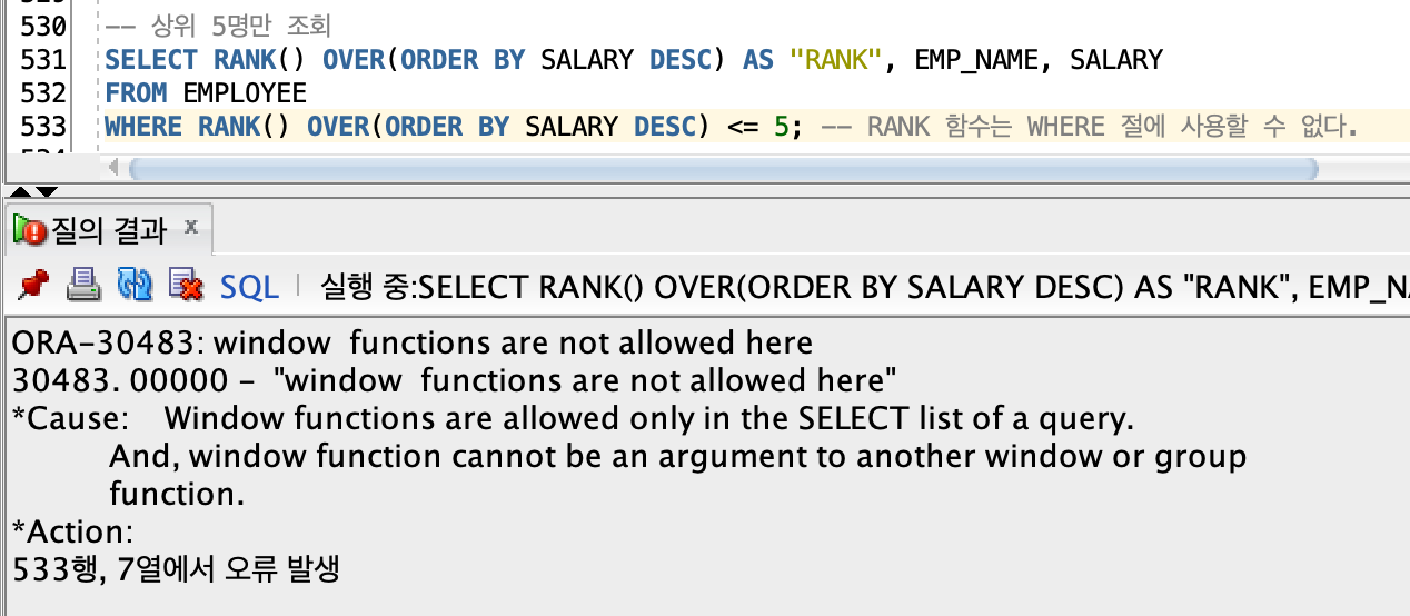 -> RANK 함수는 WHERE절에서 사용할 수 없다.