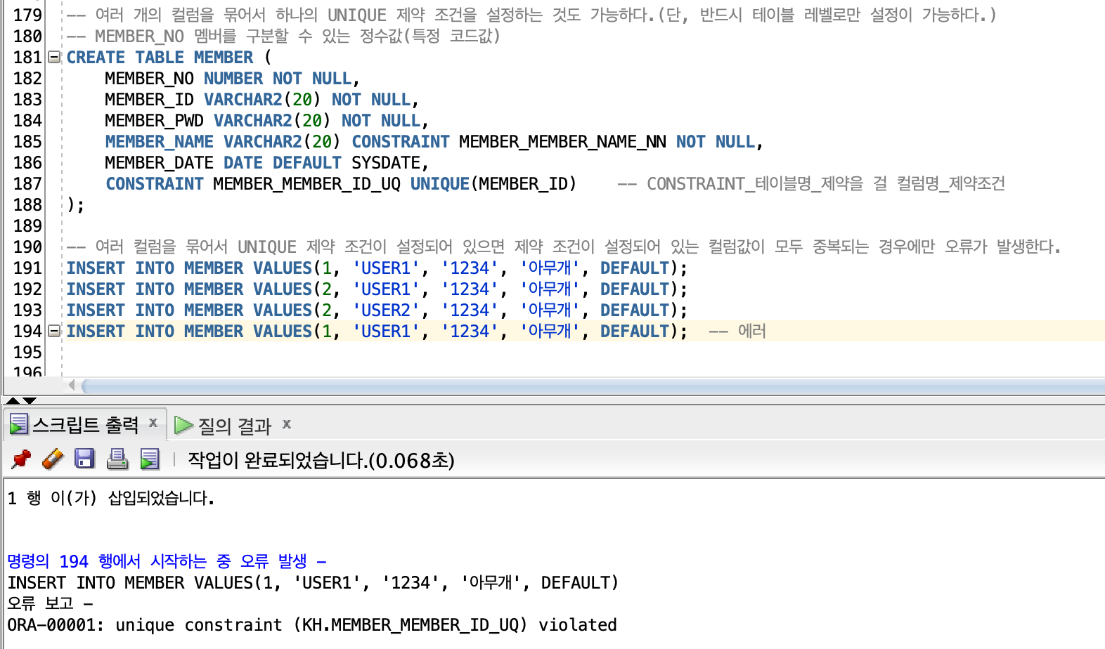 -> UNIQUE 제약조건은 NULL 값 중복은 가능 -> 테이블 생성 시 컬럼 레벨에 NOT NULL 지정하면 해결