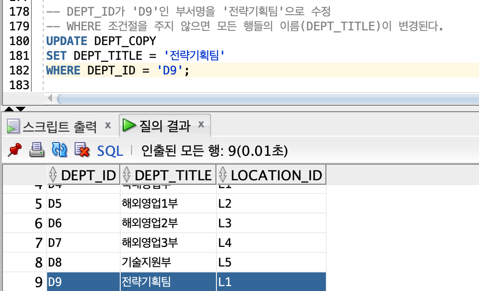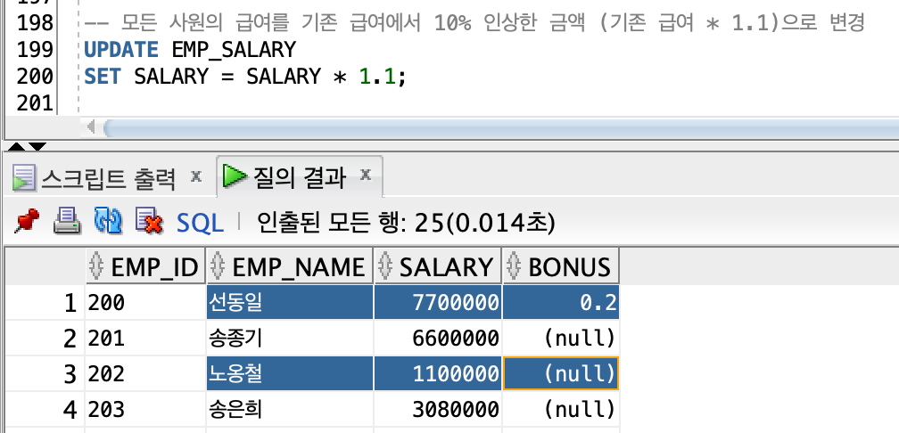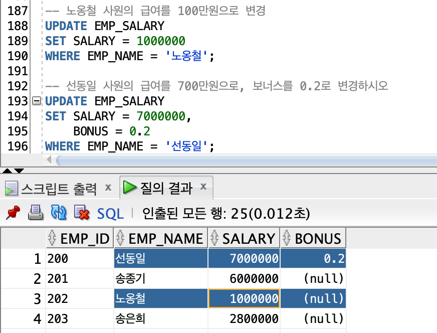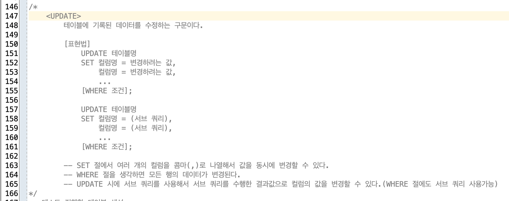 -> 테이블에 기록된 컬럼의 값을 수정하는 구문으로 테이블의 전체 행 개수에는 변화가 없다.