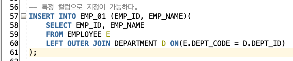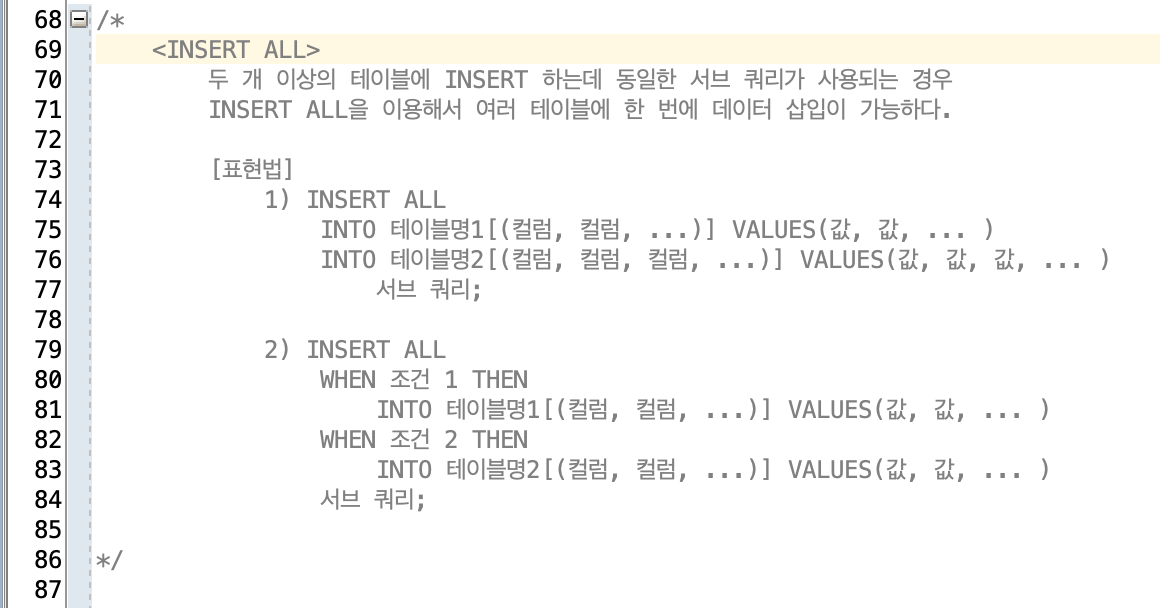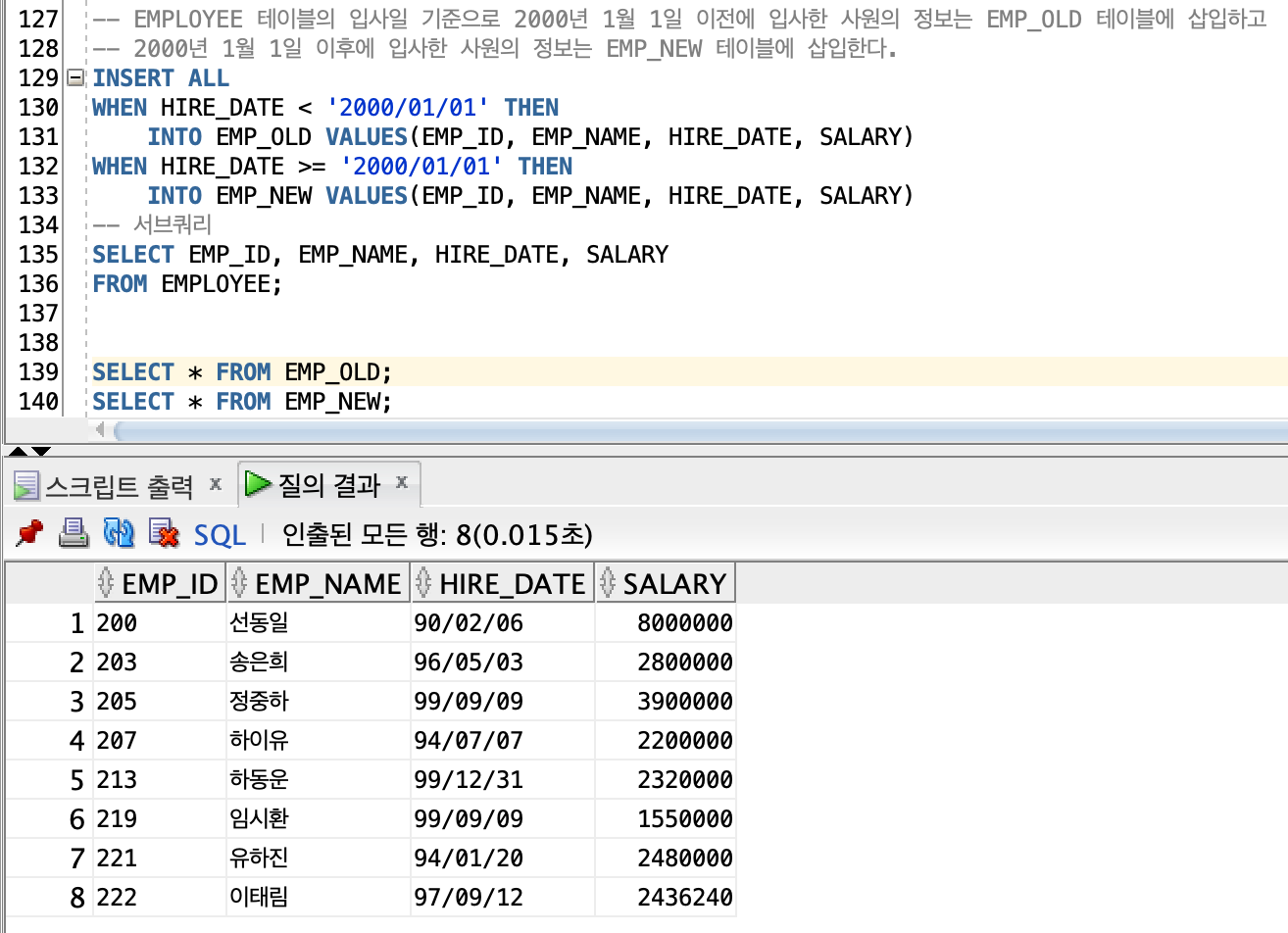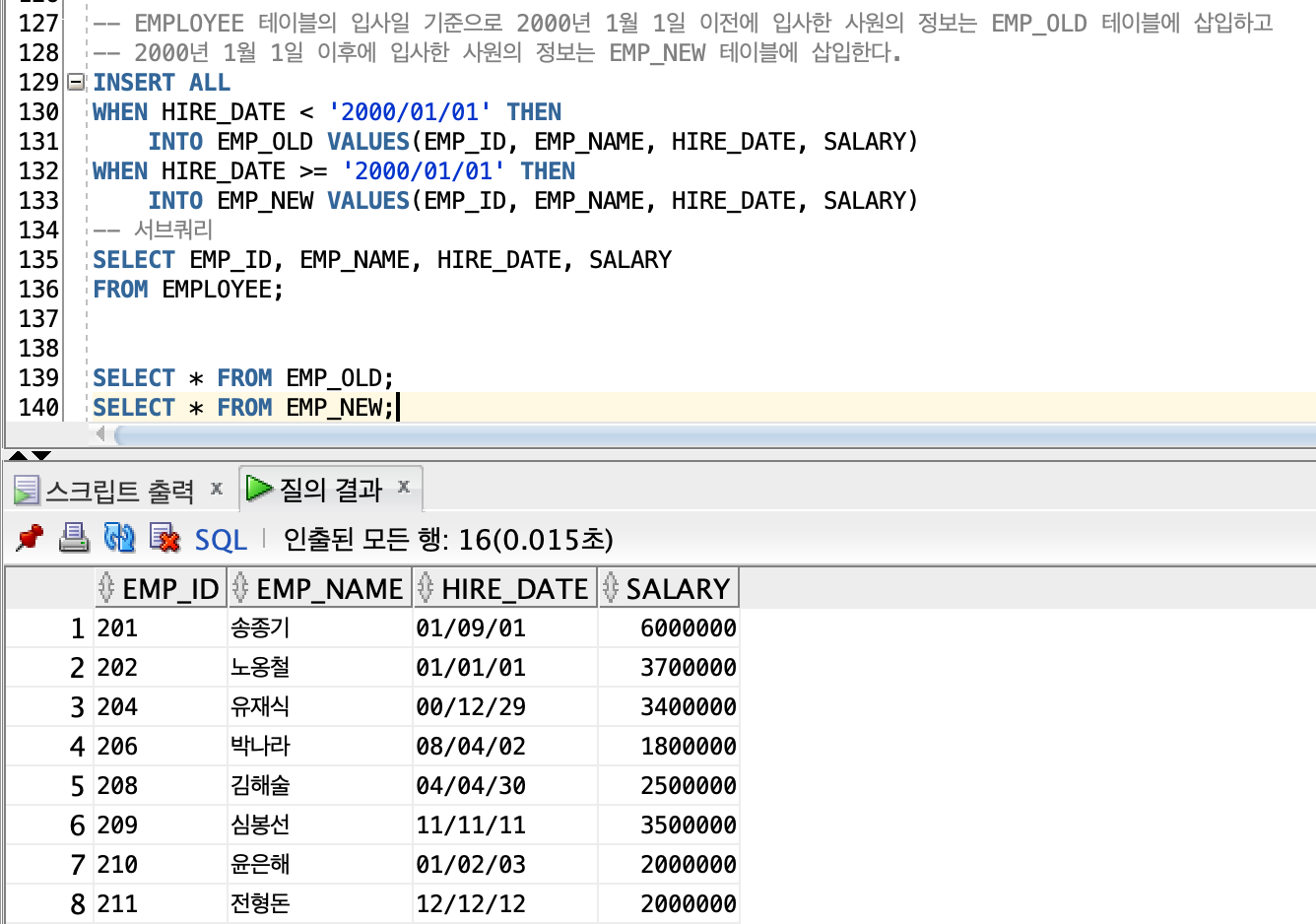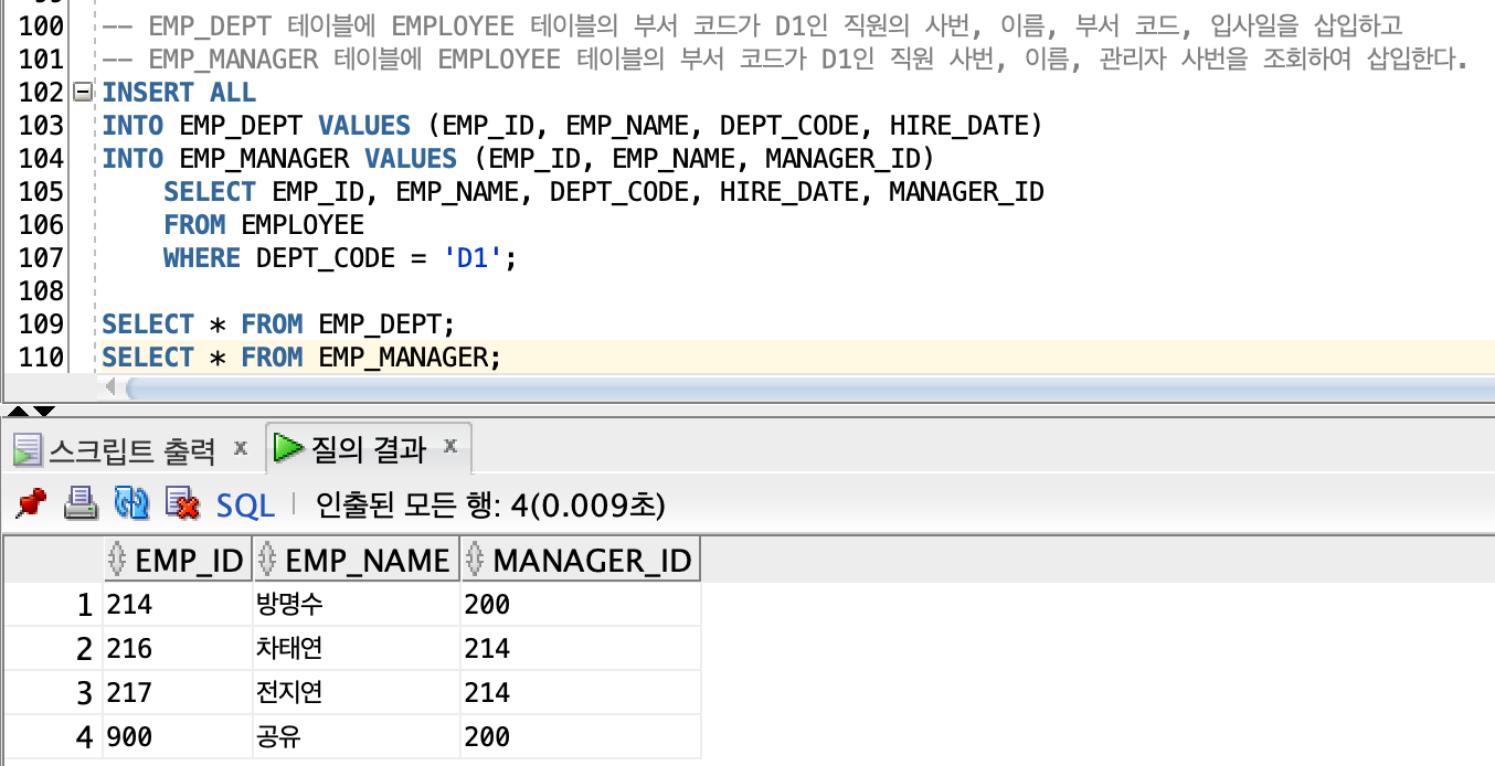 -> INSERT 시 서브쿼리가 사용하는 테이블이 같은 경우, 두 개 이상의 테이블에 INSERT ALL을 이용하여 한 번에 삽입 가능하다.