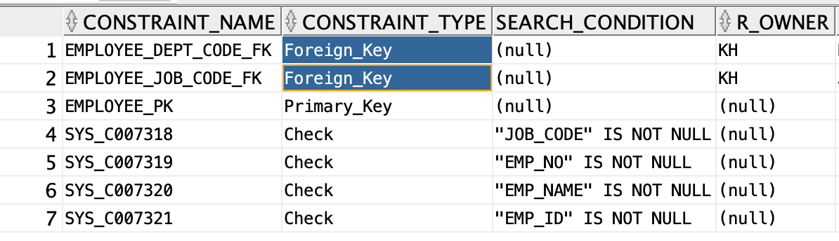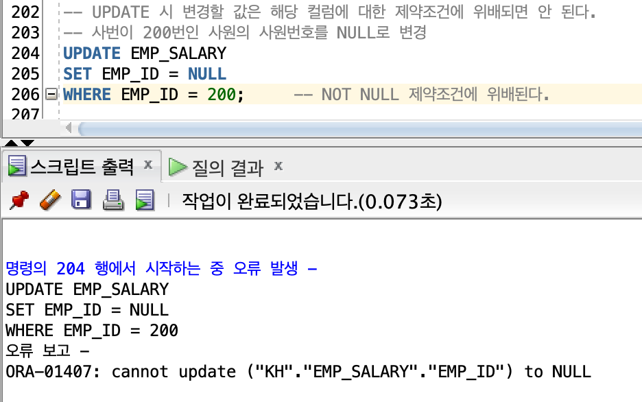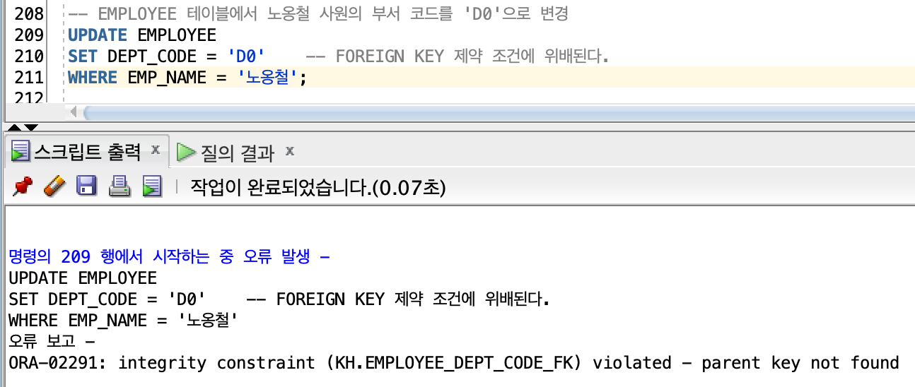 -> NOT NULL 제약 조건, FOREIGN KEY 제약조건에 위배되는 실습
