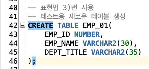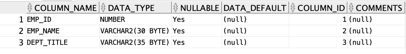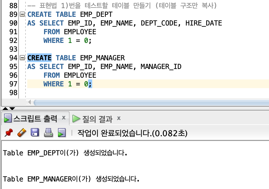 -> 서브쿼리로 조회한 결과 값을 통째로 INSERT하기 위한 테스트용 새로운 테이블 생성