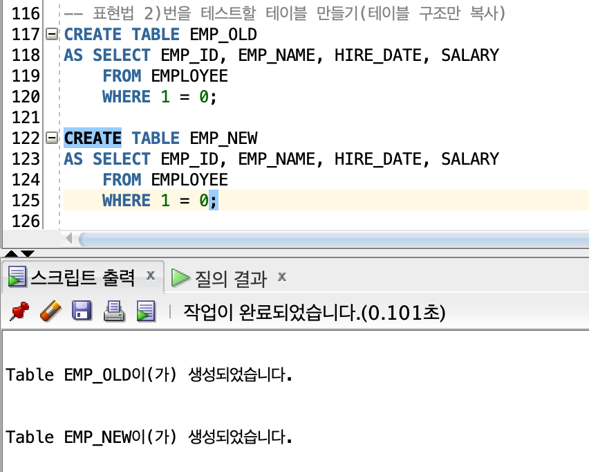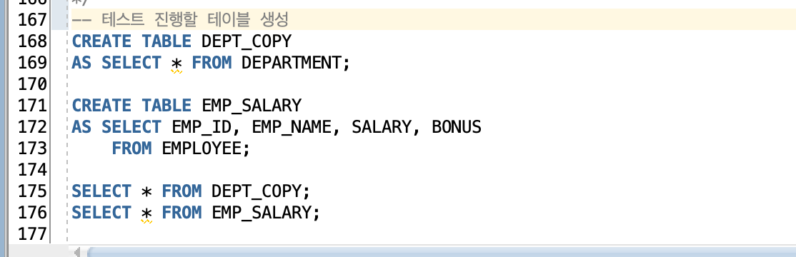 -> 테스트를 진행할 테이블(DEPT_COPY, EMP_SALARY) 생성