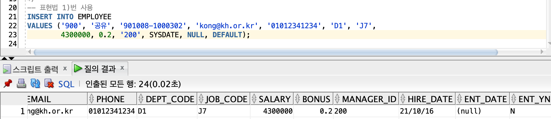 -> INSERT하고자 하는 컬럼이 모든 컬럼인 경우 컬럼명 생략이 가능하지만 컬럼의 순서를 지켜서 VALUES절에 값을 적어줘야 한다.