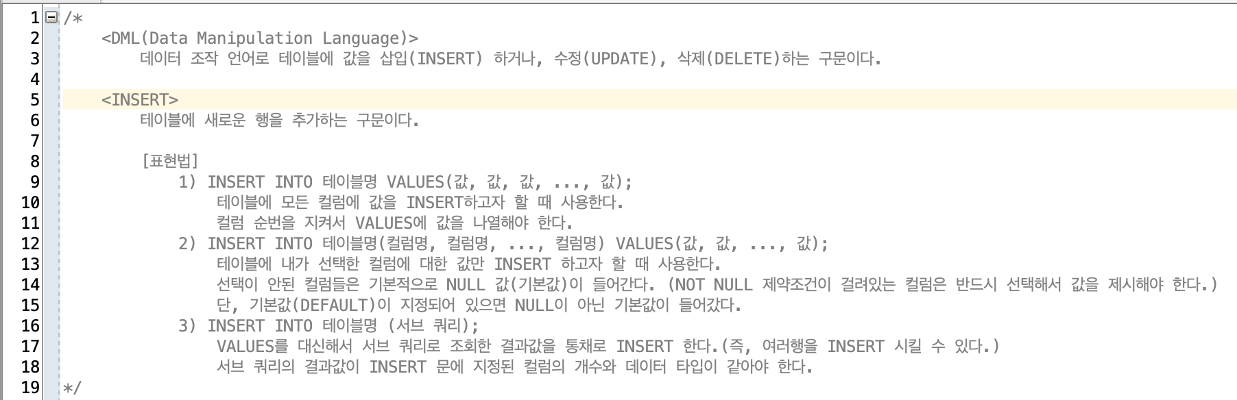 -> 데이터 조작 언어로 테이블에 값을 삽입(INSERT), 수정(UPDATE), 삭제(DELETE)하는 구문을 말함