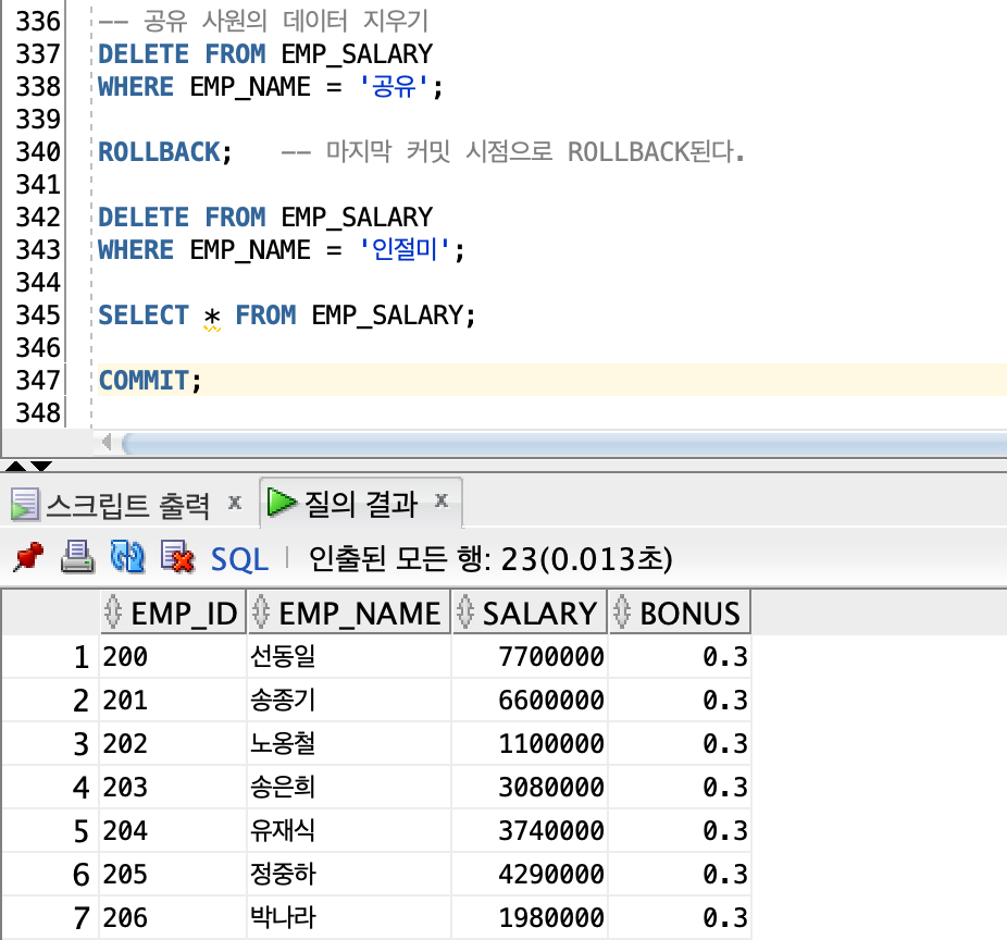 -> 두 개의 행이 삭제된 시점에 SAVEPOINT 지점을 지정해줬고, 그 다음 작업을 한 후 ROLLBACK TO SAVEPOINT 지점을 실행시켜주면 SAVEPOINT 지정점 (두 개의 행이 삭제된 시점) 으로 되돌아가게 된다. -> EMP_ID : 200 복구됨