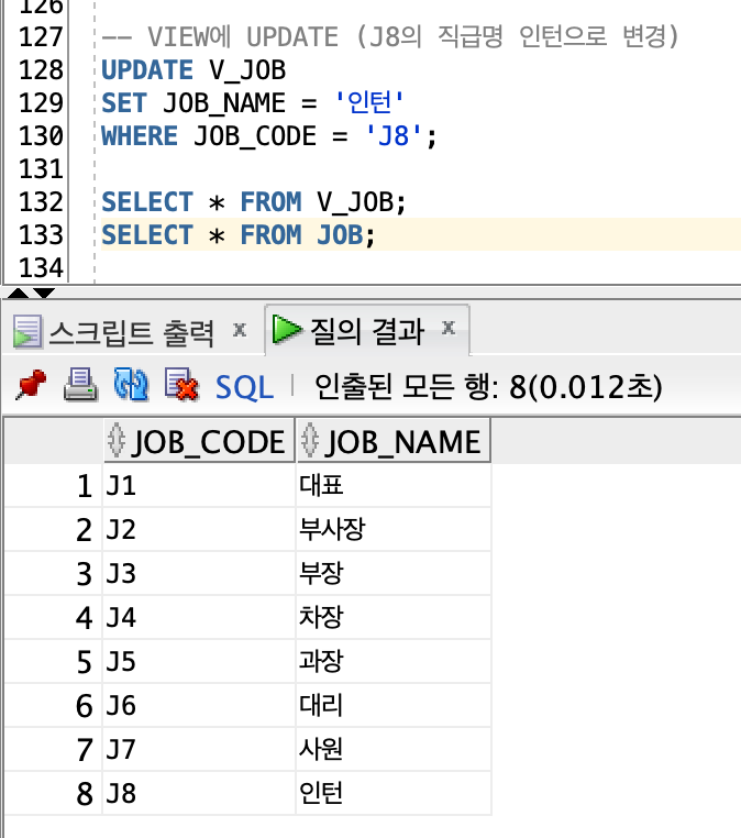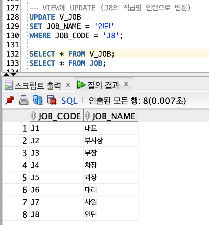 -> 뷰 테이블과 기존 테이블의 데이터가 변경되는 것을 확인할 수 있다.