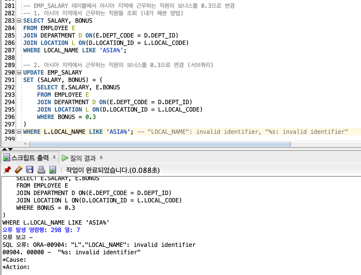 -> 1. 아시아 지역에서 근무하는 직원들 조회까지 했고, ASIA 오타로 실행이 안되는 줄 알아서 오타 수정도 했는데도 오류가 났다.
