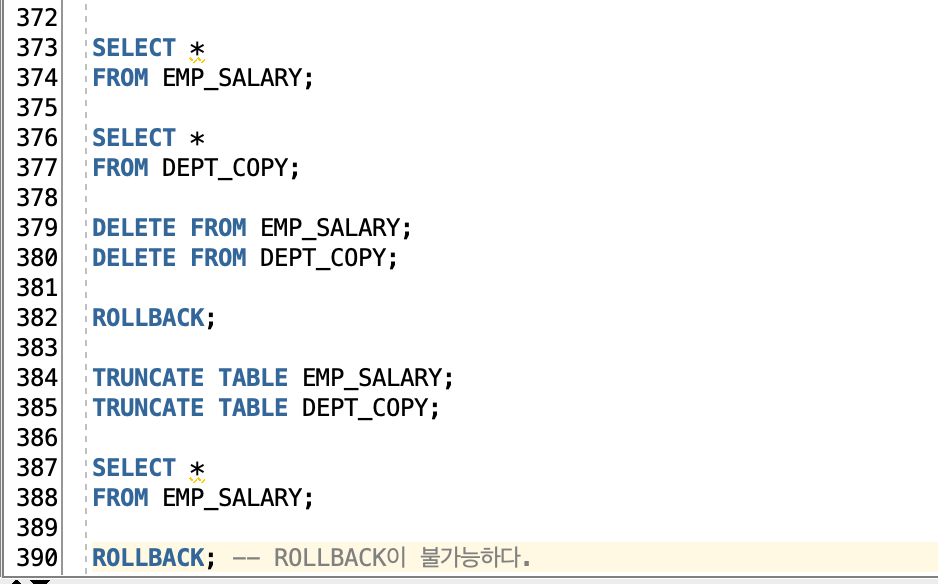 -> 테이블을 생성하면 자동으로 COMMIT이 되므로 ROLLBACK을 해주게 되면 그 시점으로 되돌아가게 된다.