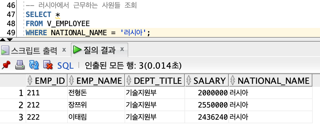 -> VIEW 테이블을 생성해주고 나서 데이터 조회를 훨씬 간략하게 할 수 있음을 확인할 수 있다.