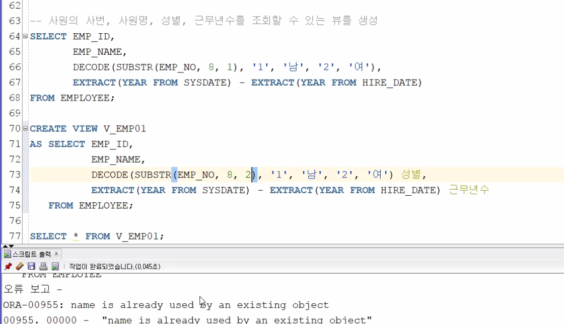 -> OR REPLACE 생략 시 기존의 동일한 뷰를 생성하는 것이기 때문에 이미 있다는 오류가 뜨게 될 것이다.