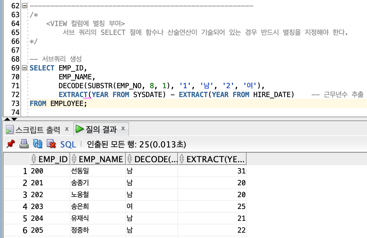 -> 서브 쿼리의 SELECT 절에 함수나 산술연산이 기술되어 있는 경우 반드시 별칭을 지정해줘야 한다.