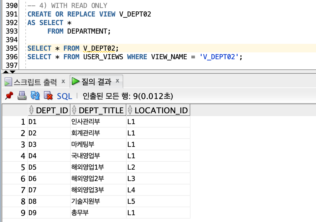 -> WITH READ OLNY 옵션 적용 되면 DML작업을 할 수 없다.