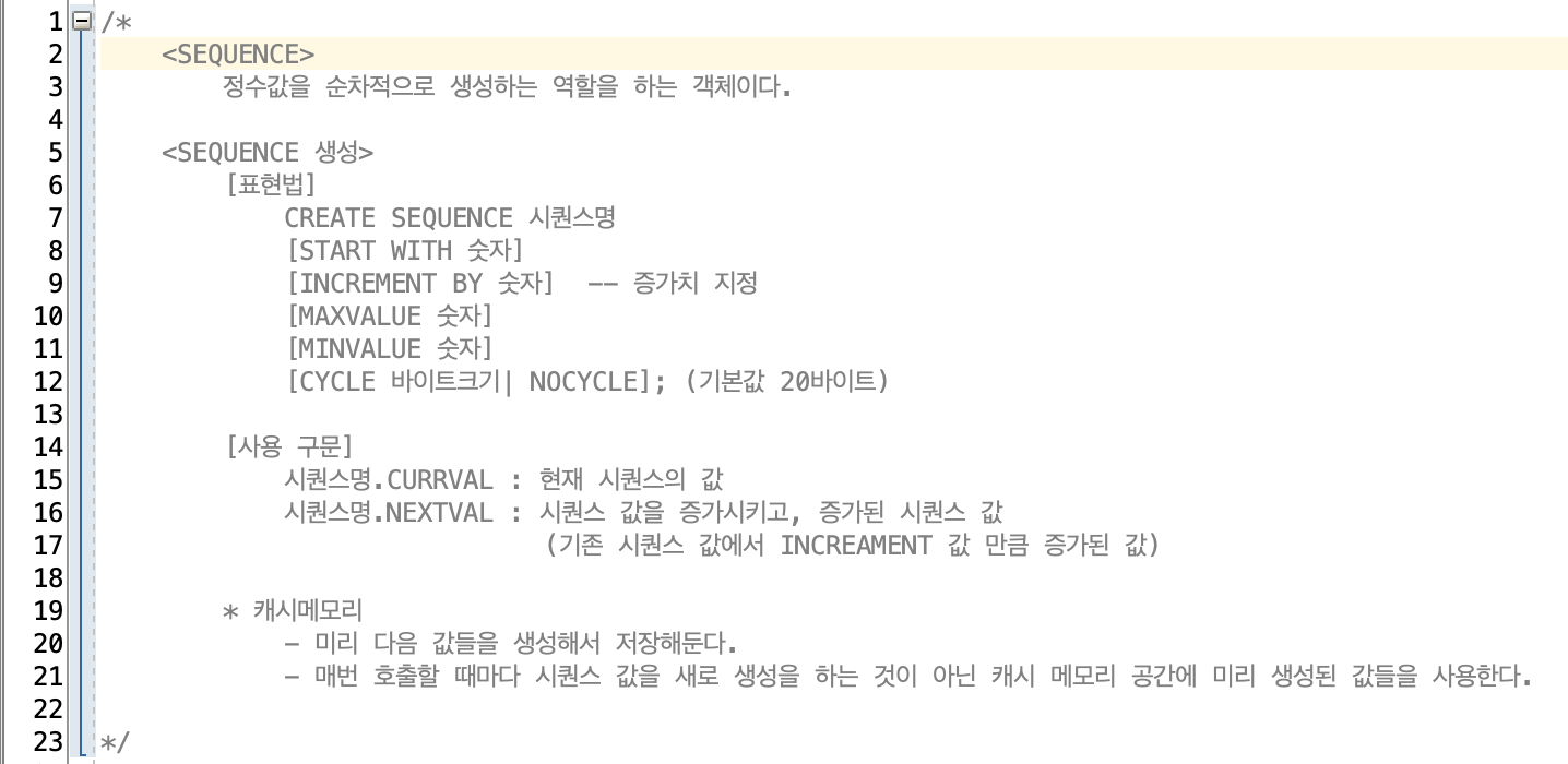 -> [CACHE | NOCACHE] -> CACHE는 메모리 상에서 시퀀스 값 관리, 기본값 20