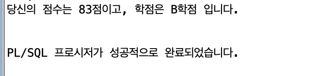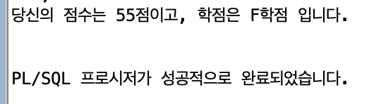 DBMS_OUTPUT.PUT_LINE('당신의 점수는 ' || SCORE || '점이고, 학점은 ' || GRADE || '학점 입니다.');