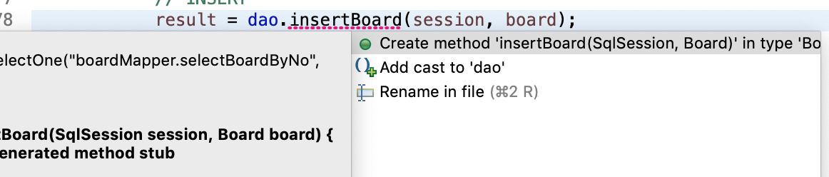 insertBoard에서 발생하는 에러 -> BoardDao에 insertBoard 메소드 생성해준다.