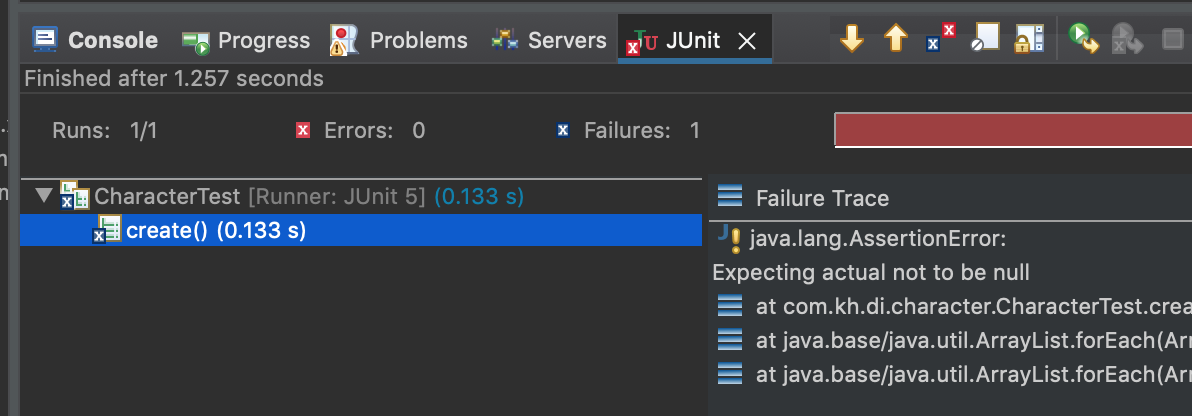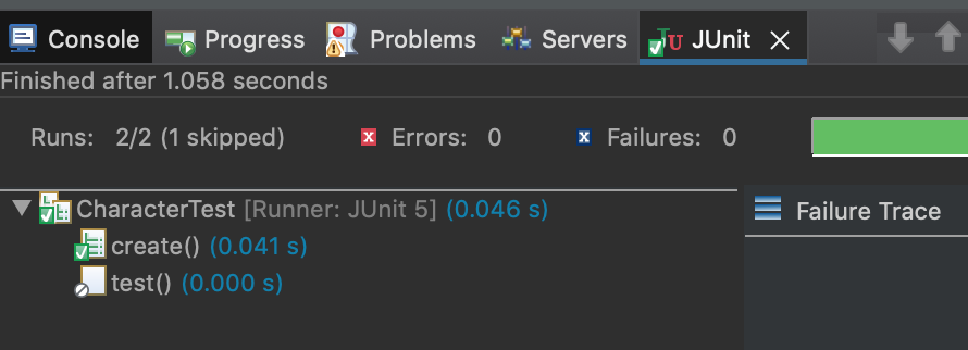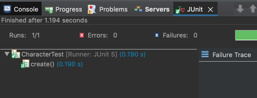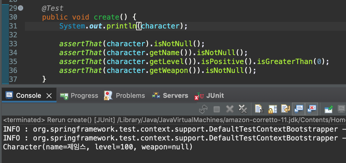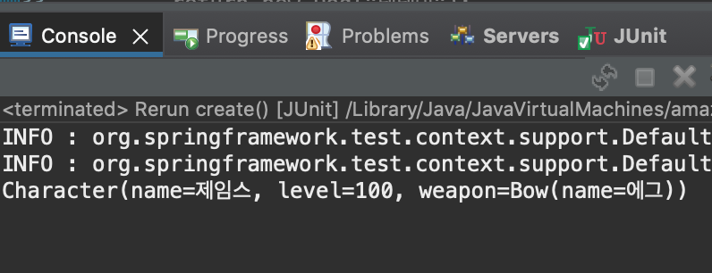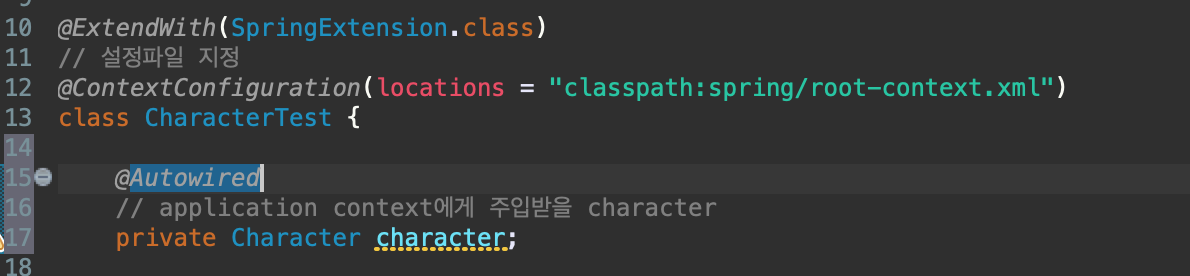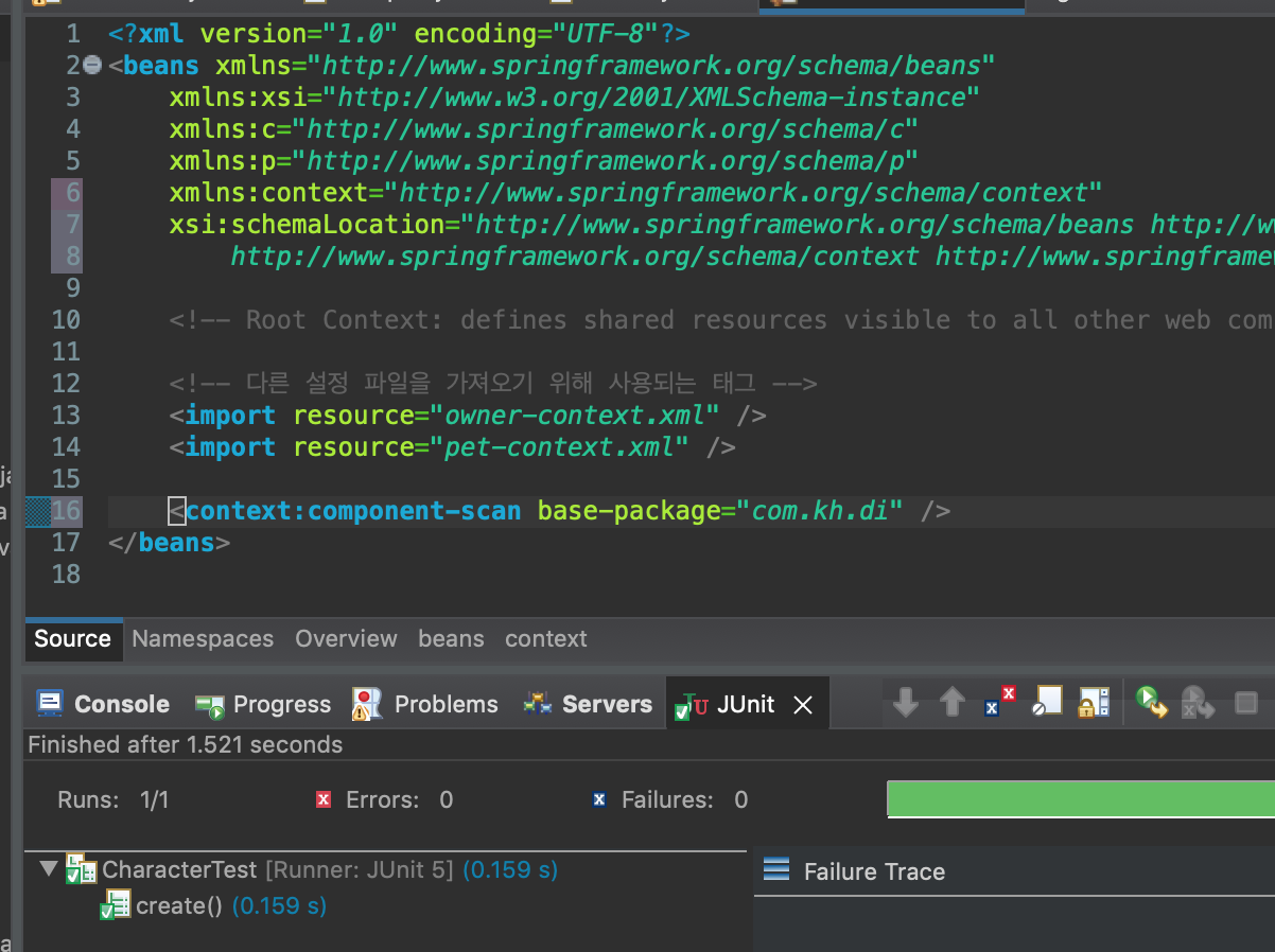 테스트 통과시 : SpringExtension에서 ContextConfiguration에 지정해놓은 설정 파일(root-context.xml)을 가져다가 문제없이 애플리케이션 컨텍스트를 만들어 줬다는 뜻으로 보면 된다.