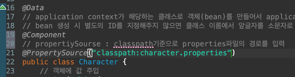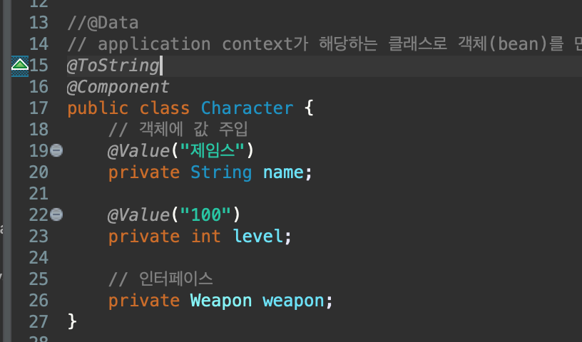 | @Value | - 단순한 값을 주입할 때 사용되는 어노테이션이다. - @Value("Spring")은 <property .. value="Spring"/>와 동일한 역할을 한다. |