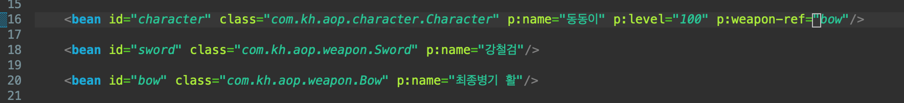 <bean id="character" class="com.kh.aop.character.Character" p:name="동동이" p:level="100" p:weapon-ref="bow"/>