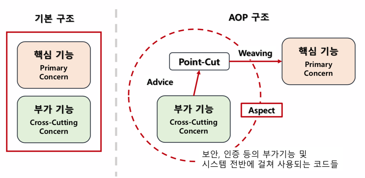 * AOP를 적용하면 실제 타겟 클래스, 비즈니스 로직 등만 작성하면 되고, 실제 런타임 시 aspect를 통해 부가 기능이 Weaving되는 형태로 처리가 된다고 보면 된다. -> 부가적인 기능에 대해서는 실제 작성하는 코드에서는 신경쓸 필요가 없음