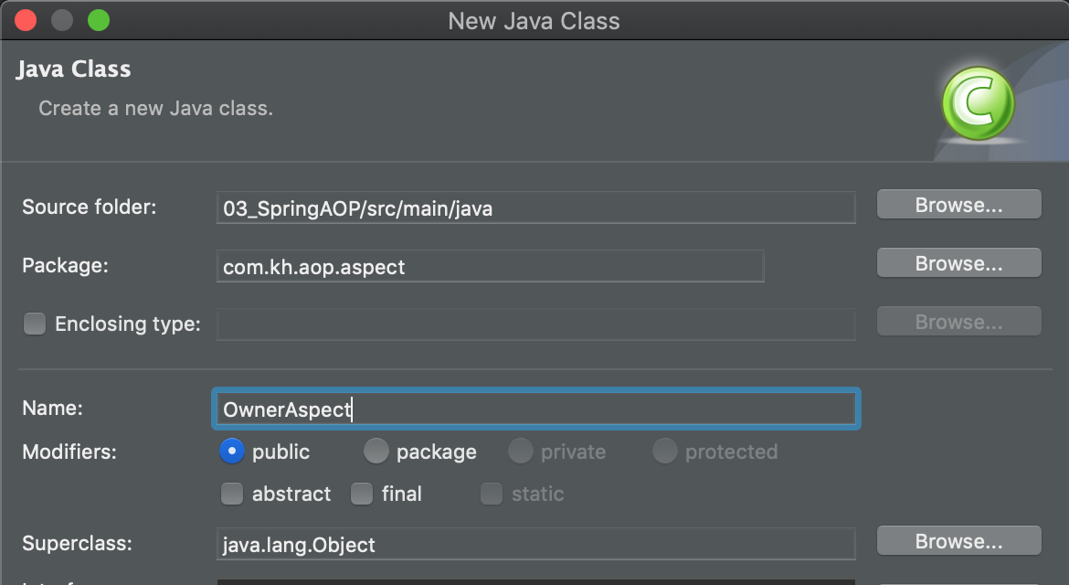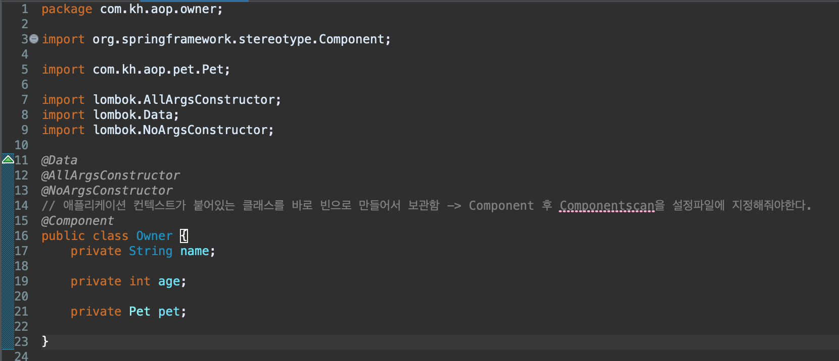 이전 SpringDI에서 작업했던 owner, pet 폴더를 aop 폴더 밑에 복사해준다. -> 패키지명 변경됐으니 수정도 해준다.