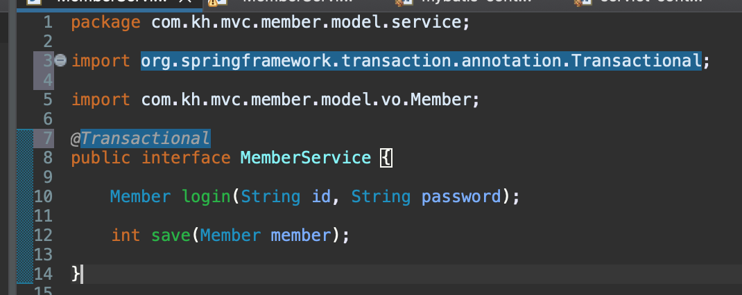 2. @Transactional을 사용해서 트랜젝션 처리가 될 수 있도록 <tx:annotation-driven />태그를 설정 파일(servlet-context.xml)에 등록한다.