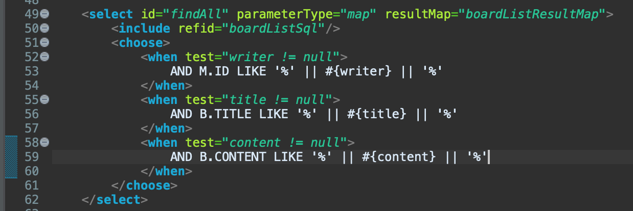 <select id="selectBoardListByFilters" parameterType="map" resultMap="boardListResultMap">
