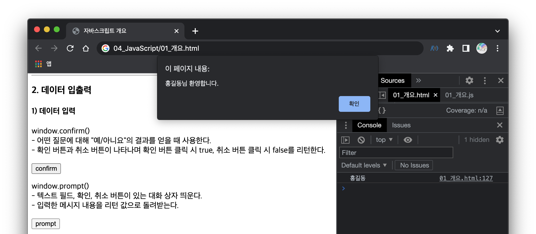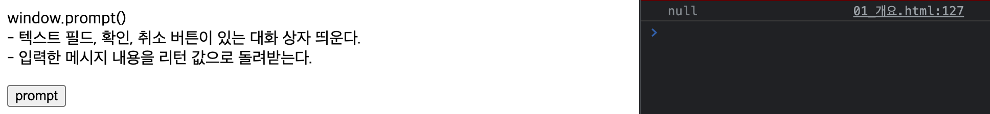 내용을 메시지 창에 출력 * window 객체는 모두 적용되는 것으로 생략 가능 |