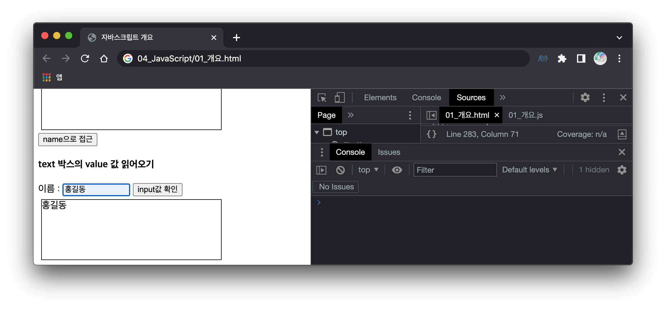 -> 이름창에 홍길동 입력 후 'input값 확인' 버튼 눌렀을 시 text박스에 value 값 출력됨.