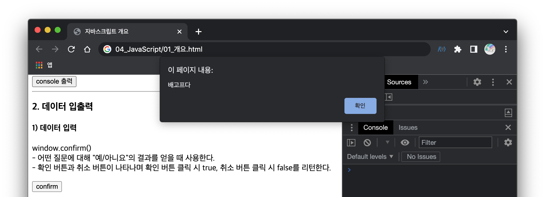- 개발자 도구 콘솔 화면에 출력하고 할 때 사용한다. (디버깅할 때 주로 사용)