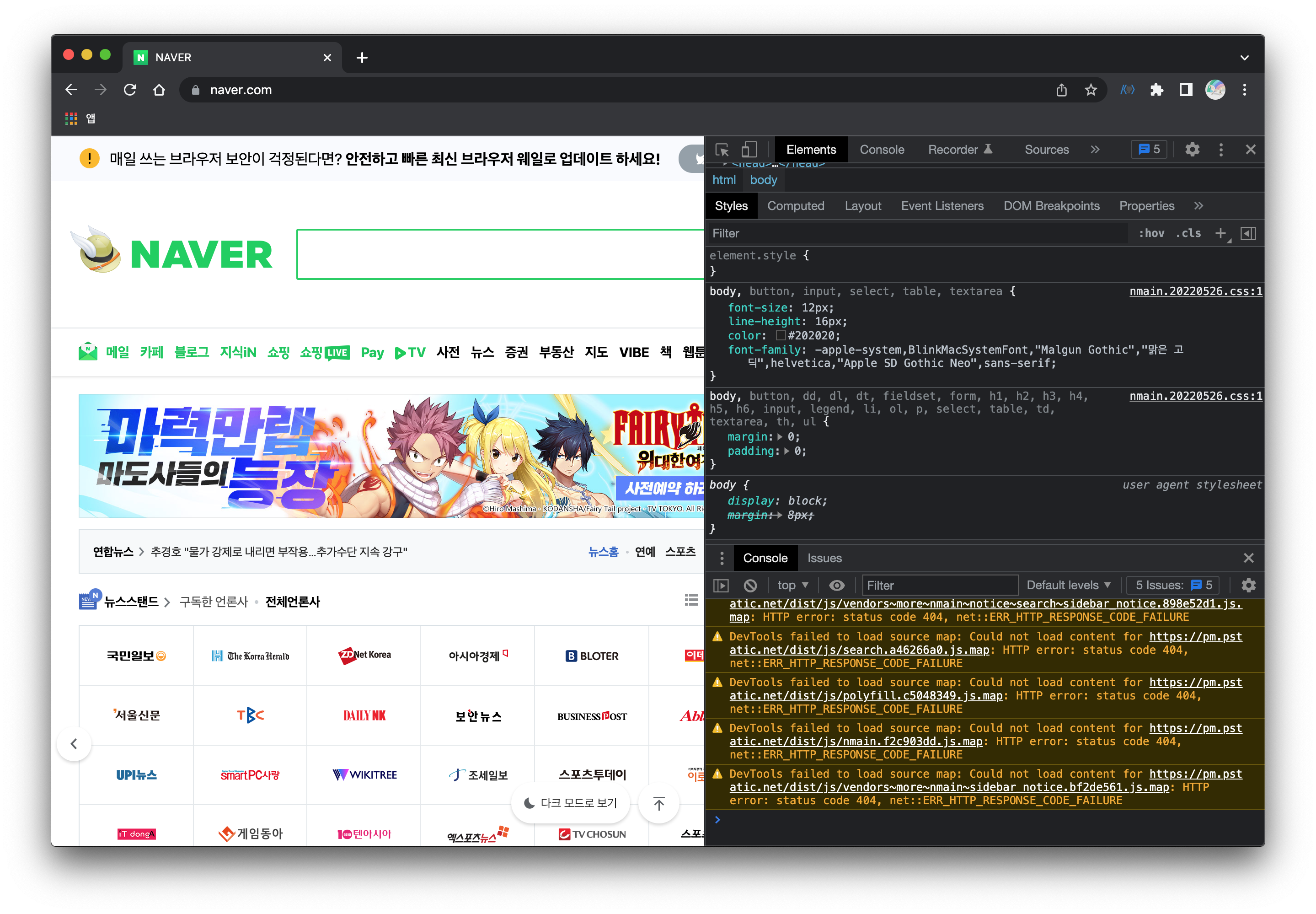 -> 브라우저 별로 개발자 도구(Developer Tools)가 있는데 크롬이나 IE브라우저의 경우 F12키를 눌러 실행함.