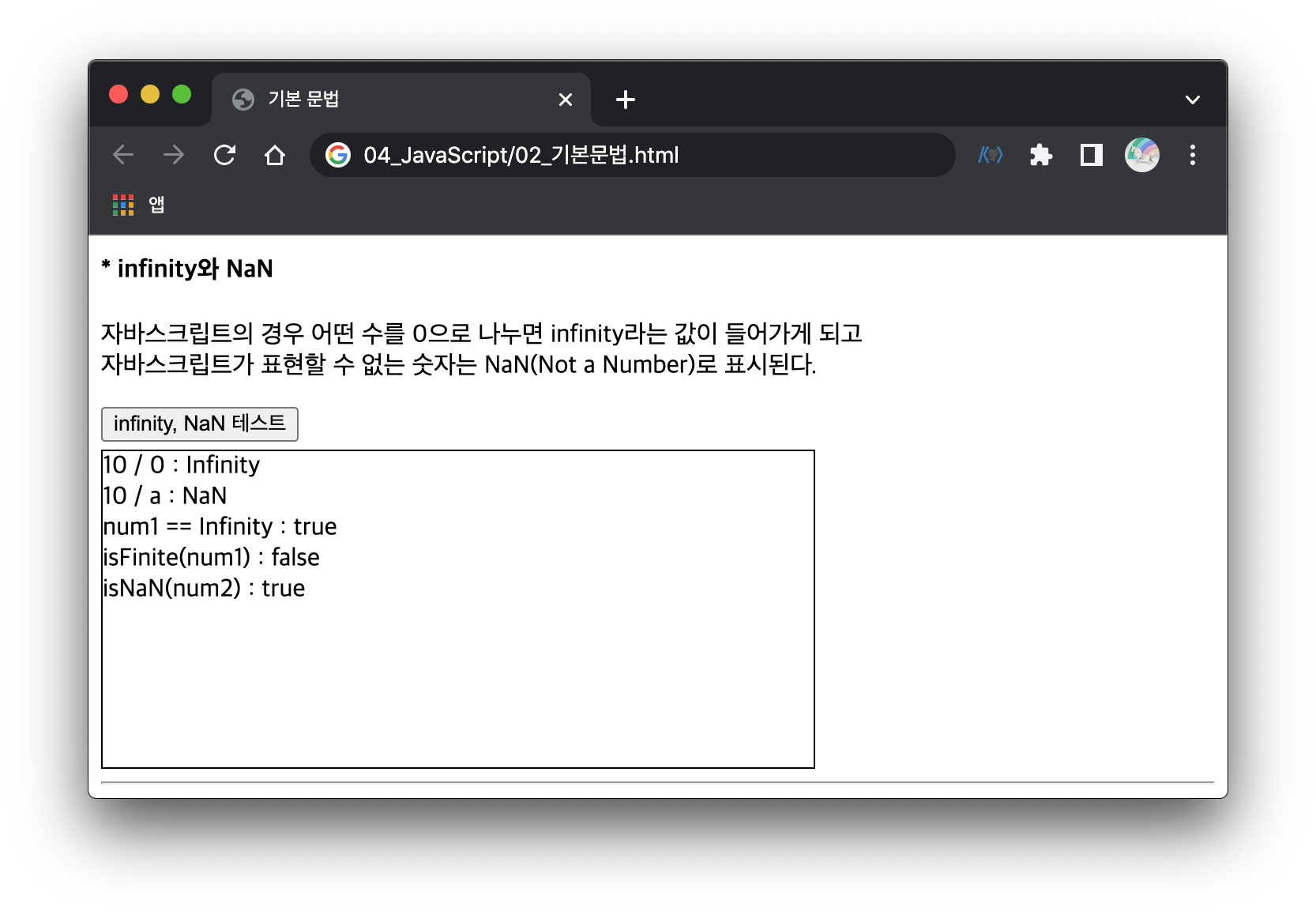 <button onclick="opTest();">infinity, NaN 테스트</button>